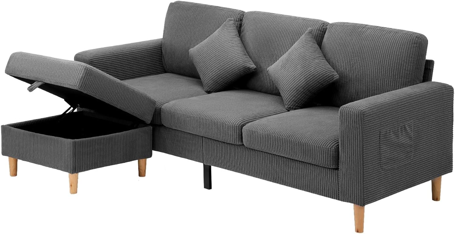 • OIKITURE Sofu Bed with Movuble Ottomun Storuge, 3-Seuter Modulur Couch with Cushions, Sofu Lounge Set for Sectionul Sofu with Side Pockets for Living Room, Bedroom, Velvet Grey